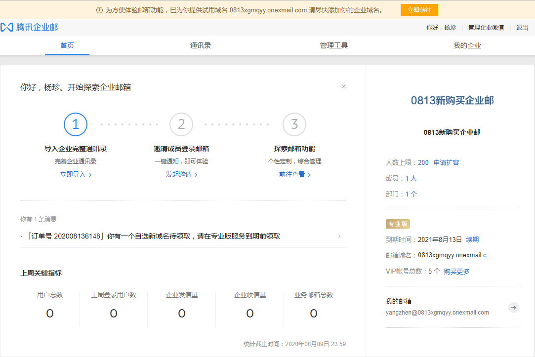 第三步:注册成功。登录企业邮管理后台,同时企业微信或者服务号下发注册成功通知。